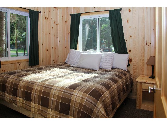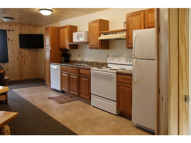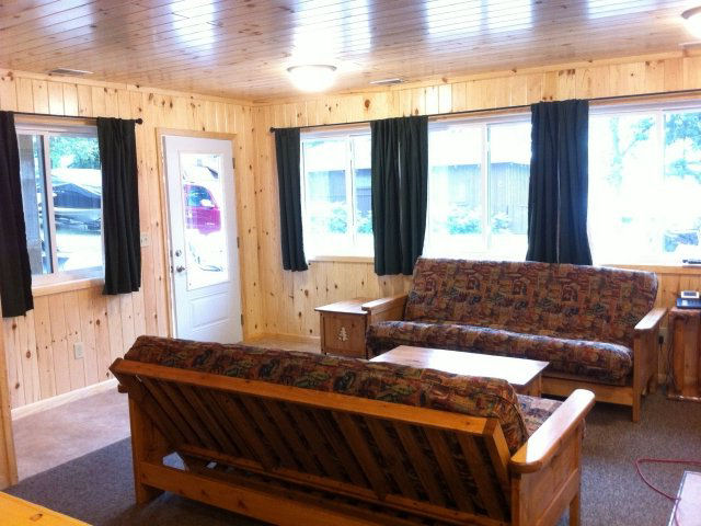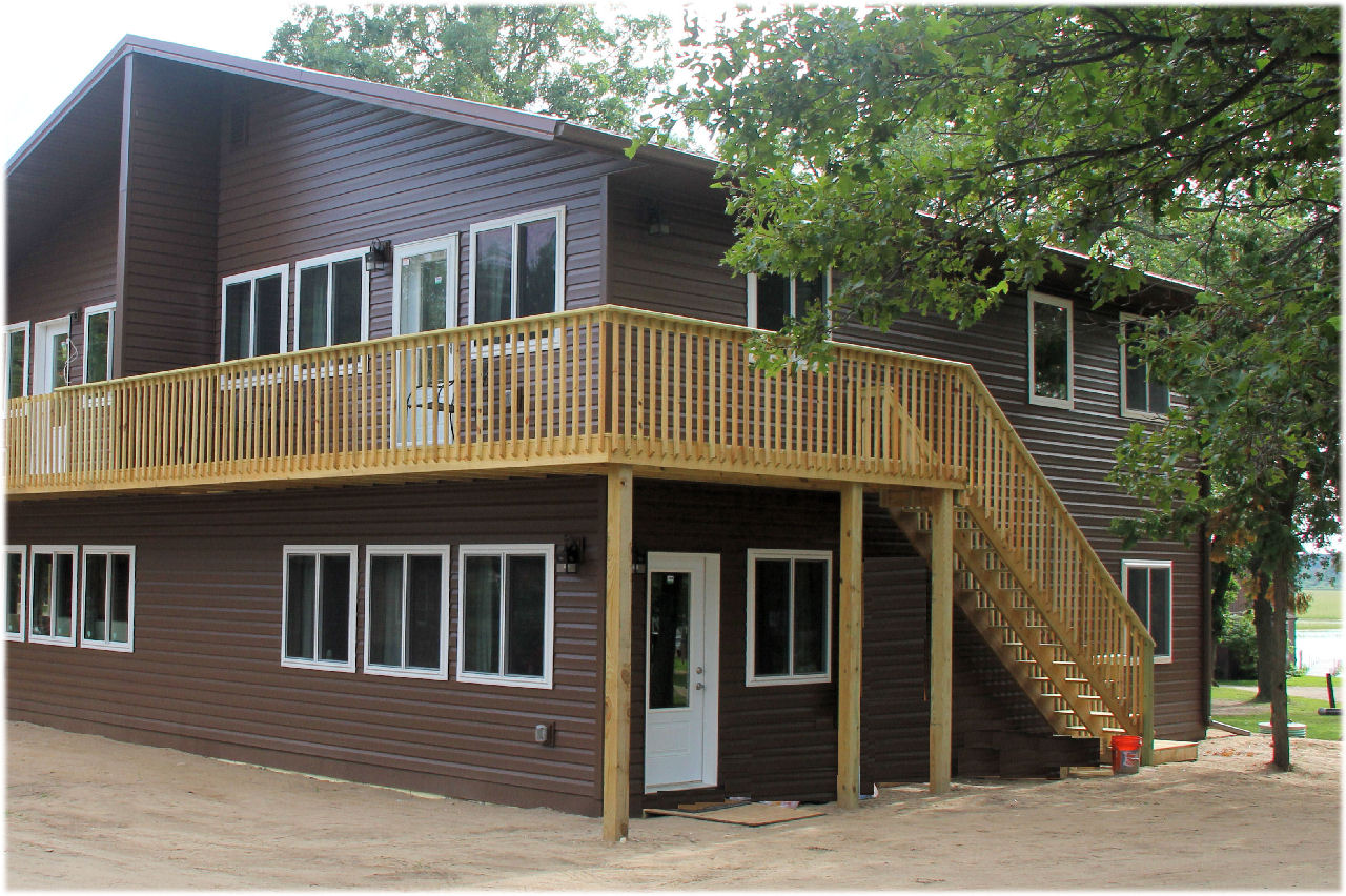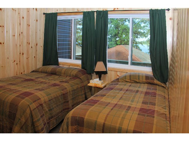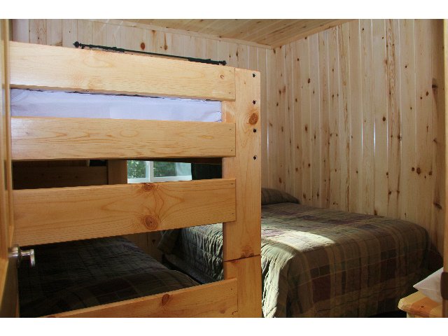 Cabin 7 is totally new from the ground up in 2011. It is part of a 2 story building split side-by-side into as a duplex with cabin 6. Cabin 7 has 4 bedrooms with a total of 10 beds (1 King, 3 Full size and 6 twins). Downstairs has 2 full size sleeper futons with a 42" LED LCD TV. Upstairs there is another living area with a second 42" LED LCD TV and another full size sleeper futon. The cottage is centrally located on the peninsula and has great views looking West at the sunsets over Cutfoot Sioux. A second story deck spans the entire west side of the cabin offering arguably the best sunset viewing on the entire peninsula. There is a full bathroom on both levels of the cabin. The first floor of this cabin is fully handicapped accessible complete with a roll/walk in 5 foot shower. The entire cabin is finished is tongue and groove pine. Central forced air heating and air conditioning keep the temperature to your liking. 3 dock slips are included with rental of cabin 7. |