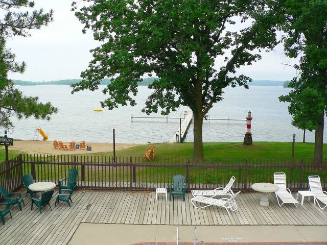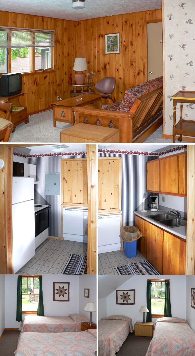 Cabin 23 has 2 bedrooms with 2 full and 3 twin beds plus an innerspring mattress sleeper futon. The cottage is attached to the lodge and is a second story cabin. The cabin features a "crow's nest" deck right above the pool. The elevated view looks due West and provides great views of the sunsets over Cutfoot Sioux. Wonderful breezes off the lake! There is also a set of external stairs leading up to the deck to make access to the cabin (and pool)easier. |